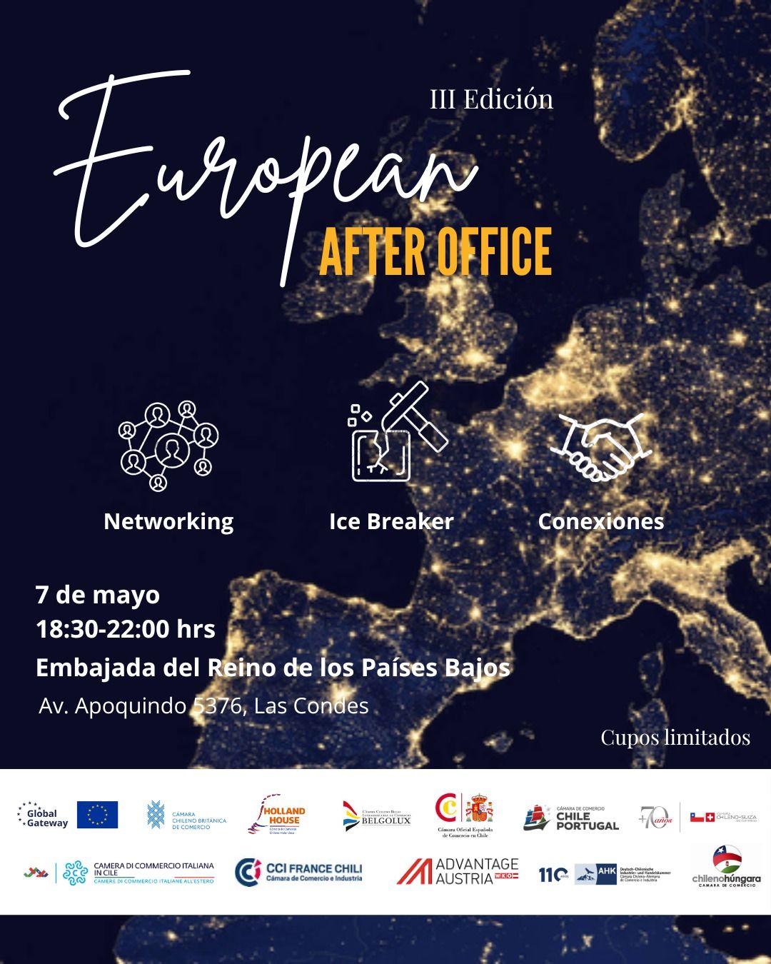 Nos complace invitarlos a la 3.ª Edición del European After Office Cocktail, que se llevará a cabo el próximo jueves 7 de mayo de 2026, de 18:30 a 22:30 hrs., en la Residencia de la Embajada del Reino de los Países Bajos (Av. Apoquindo 5376, Las Condes).