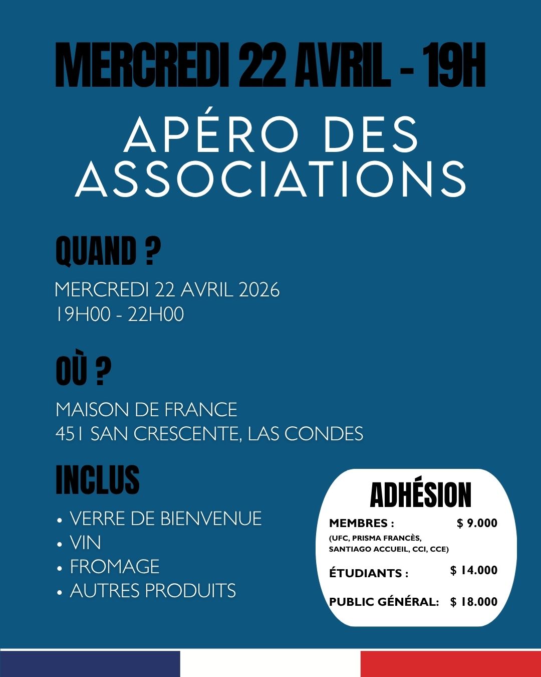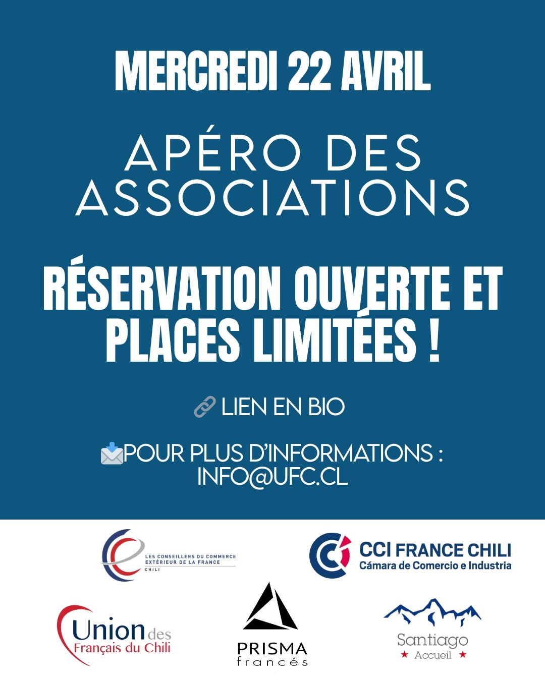 Ce mercredi 22 avril 2026, l’@UFC, @SantiagoAccueil, @PrismaFrancés, la @CCI et les @CCEF vous invitent à leur apéro des associations à la Maison de France ! 🇫🇷🇨🇱
