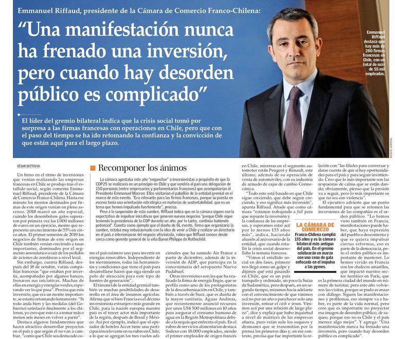 El líder del gremio bilateral, Emmanuel Riffaud, indica que la crisis social tomó por sorpresa a las firmas francesas con operaciones en Chile, pero…