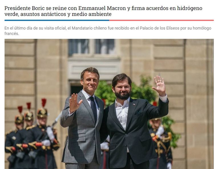 Presidente Boric se reúne con Emmanuel Macron y firma acuerdos en hidrógeno verde, asuntos antárticos y medio ambiente Importantes acuerdos en…