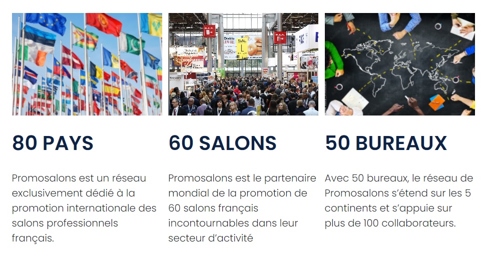 La Chambre de Commerce et d’Industrie Franco-Chilienne représente l’association PROMOSALONS au Chili, qui se consacre à la promotion des salons professionnels français, qui se développent et se déroulent tant en France que dans le reste du monde.