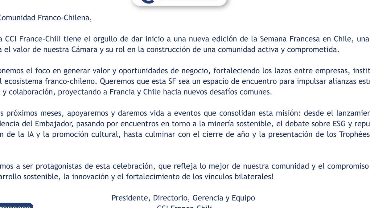 Este año la CCI France-Chili tiene el orgullo de dar inicio a una nueva edición de la Semana Francesa en Chile, una tradición que refleja el valor de nuestra Cámara y su rol en la construcción de una comunidad activa y comprometida.