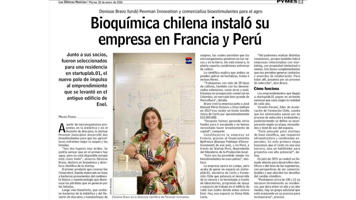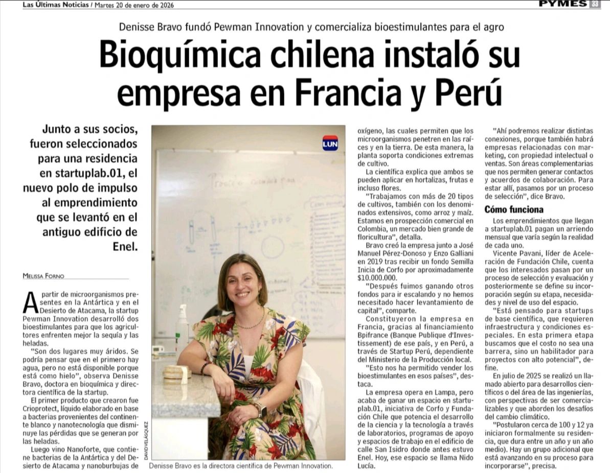 Fundada por Denisse Bravo y @José Manuel Perez-Donoso; Pewman ha logrado llevar hashtag#innovación científica chilena al agro internacional, desarrollando bioestimulantes a partir de microorganismos extremos, con impacto en productividad y sostenibilidad.
