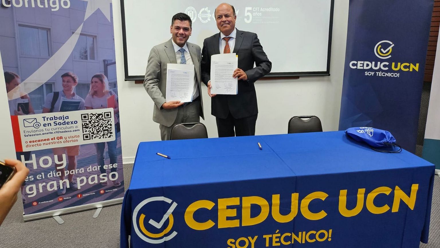 El acuerdo, firmado en una ceremonia que tuvo lugar en las instalaciones de CEDUC UCN, contó con la presencia de Rudy Segura, Jefe de R&S zona norte, y Adrián Valdés, subgerente de RRHH zona norte, por parte de Sodexo y de autoridades académicas, y representantes del ámbito empresarial y educativo de la región.