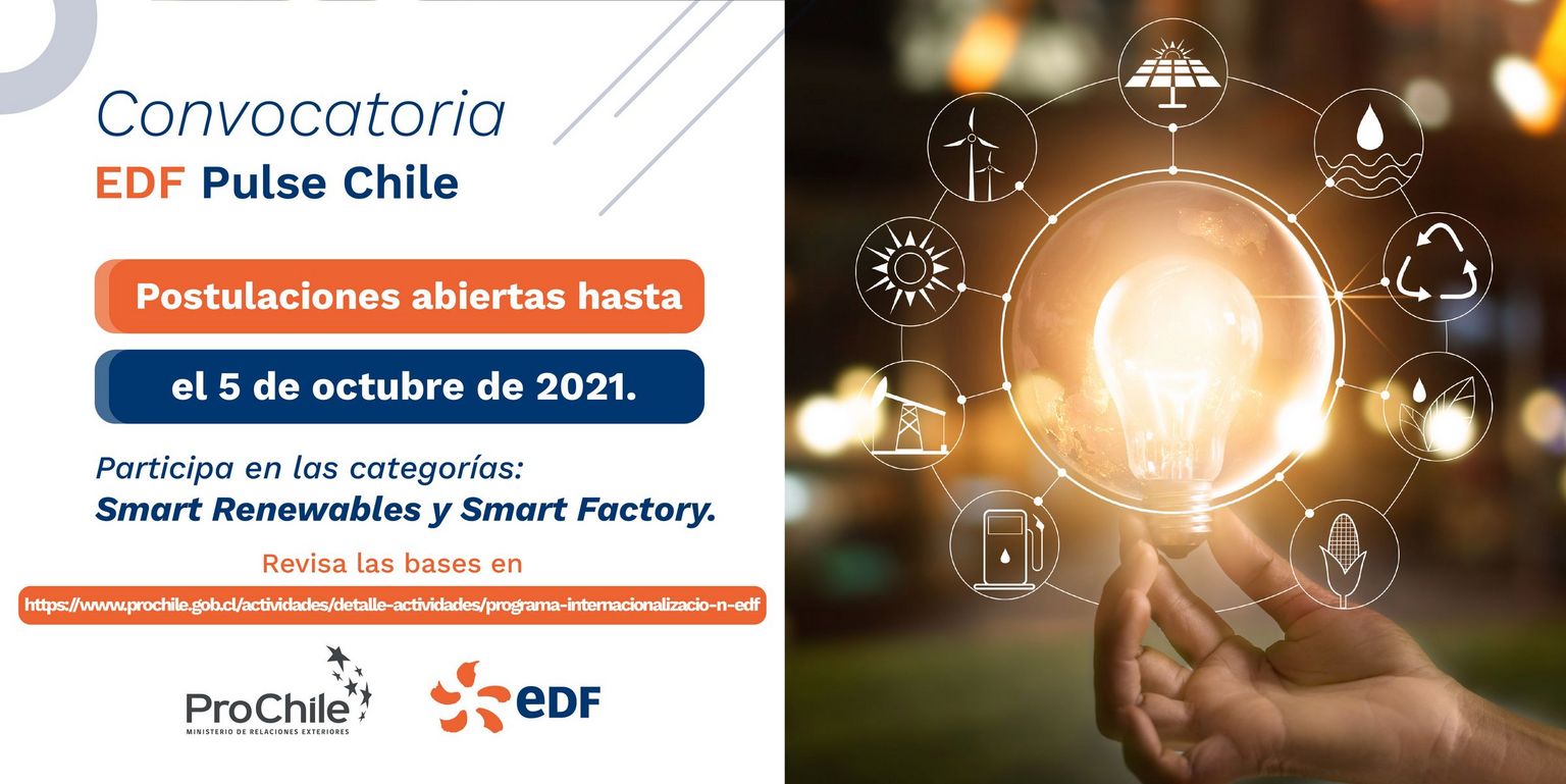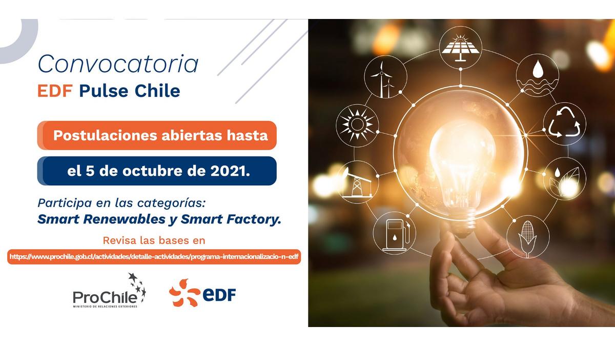 EDF, con el apoyo de ProChile, abrió la convocatoria del concurso EDF Pulse Chile, iniciativa que se realiza por primera vez en el país y que busca escalar soluciones innovadoras que estén desarrollando startups y scaleups chilenas y que contribuyan a la construcción de un mundo más eléctrico y amigable con el medioambiente.