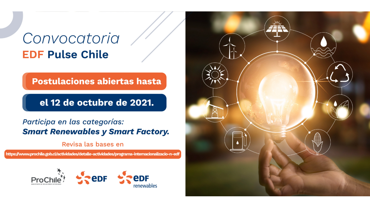 - EDF Pulse Chile, iniciativa impulsada por la empresa de energía francesa con apoyo de ProChile, extiende hasta el 12 de octubre de 2021 su convocatoria dirigida a startups y scaleups que desarrollen soluciones eléctricas innovadoras y amigables con el medioambiente.