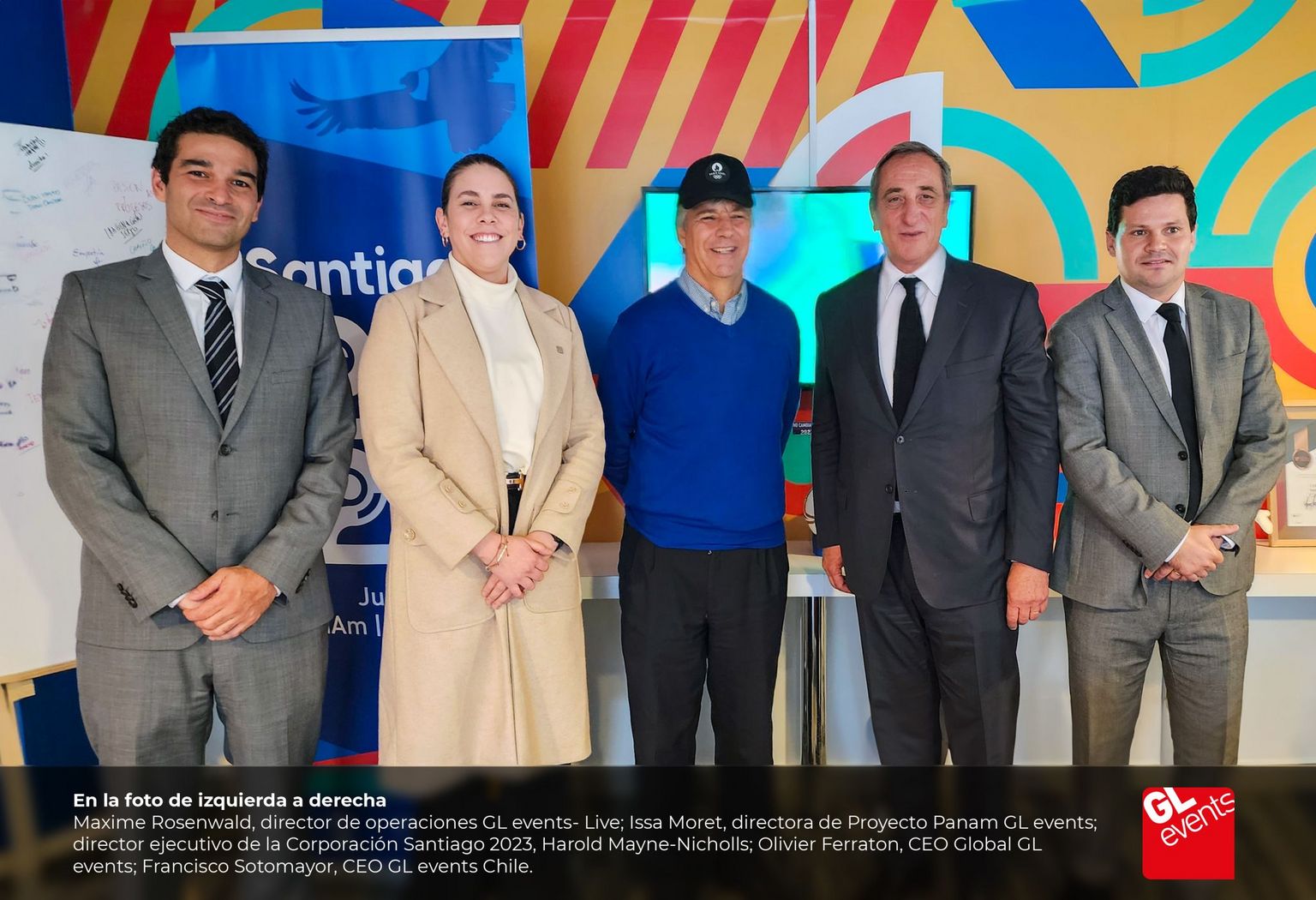 Culminado el proceso y tras la adjudicación, el director ejecutivo de la Corporación Santiago 2023, Harold Mayne-Nicholls, recibió en sus oficinas a los altos ejecutivos de GL events encabezados por Olivier Ferraton, CEO Global GL events; Francisco Sotomayor, CEO GL events Chile; Maxime Rosenwald, director de operaciones GL events- Live e; Issa Moret, directora Proyecto Panam GL events.