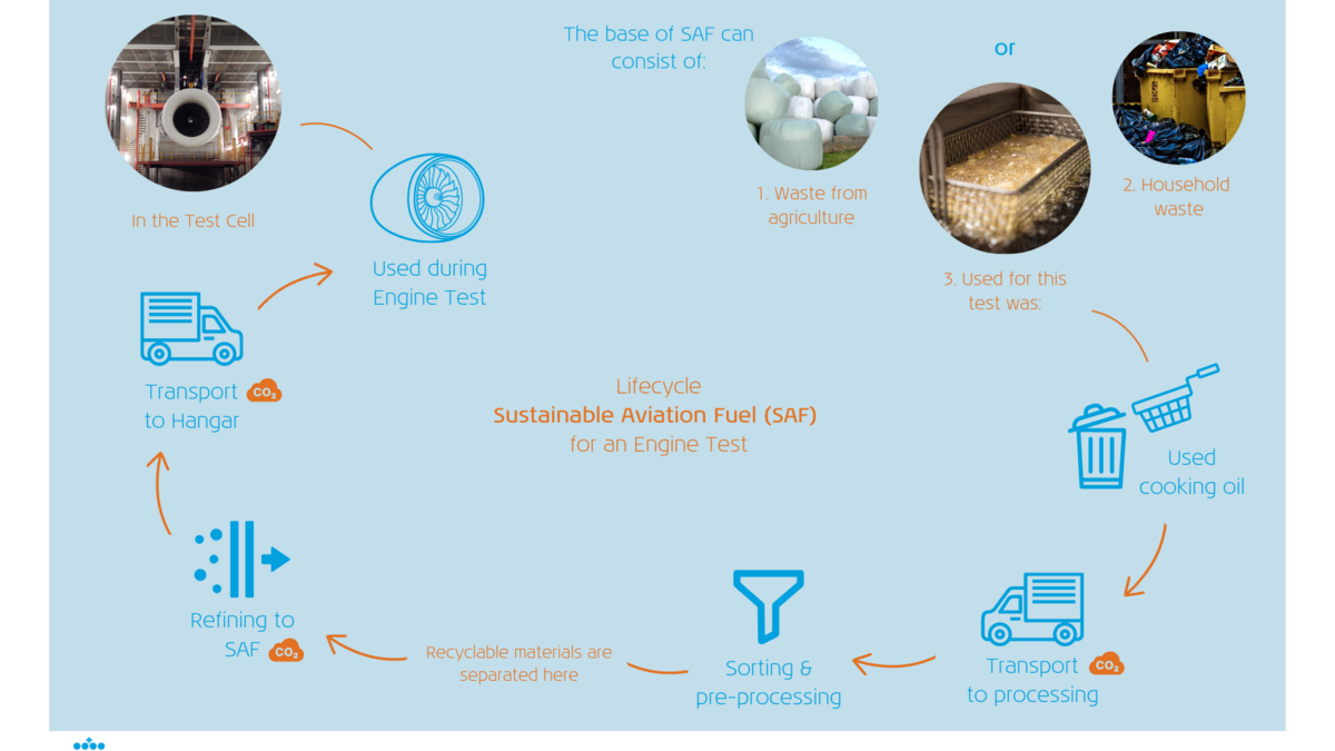 Para una prueba de motor la materia prima SAF podría consistir en: (1) Residuos forestales y residuos agrícolas o (2) Residuos domésticos. Durante esta prueba, se hizo una elección para: aceite de cocina usado, transporte después del procesamiento CO2, clasificación y preprocesamiento, los materiales reciclables se separan aquí en: Refinar en SAF - CO2, Transporte al hangar - CO2 utilizado para la prueba del motor en la celda de prueba CO2 – Extra CO2 se libera aquí.
