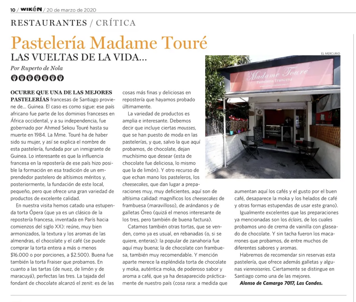El artículo alaba los productos que ofrece esta pastelería fundada por Salam Touré, un inmigrante guineano que se ha ganado una gran reputación en la capital chilena gracias a su "savoir faire" y calidad en todo lo que ofrece.