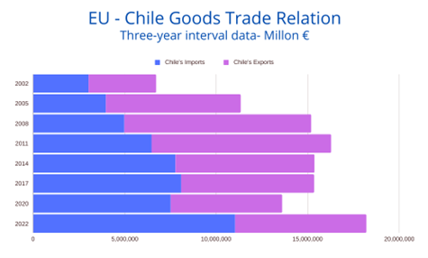 A nivel comercial, desde la entrada en vigor del Acuerdo de Asociación, el flujo de comercio bilateral se ha duplicado con creces. La Unión Europea sigue siendo, al día de hoy, el tercer socio comercial de Chile, representando un 13% del comercio total y Chile es el segundo socio comercial de la UE en América Latina