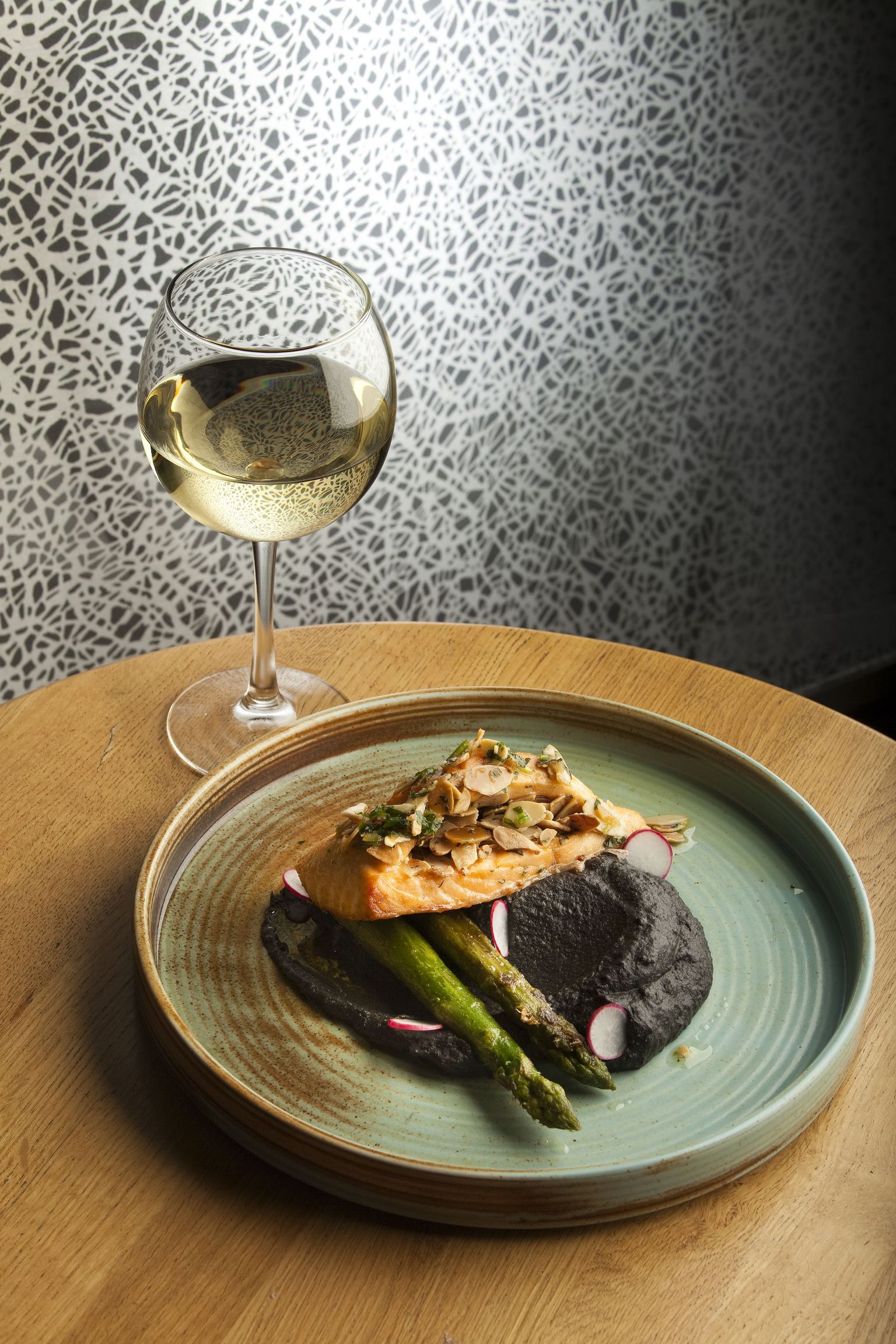 Salmón patagónico acompañado de puré negro, espárragos y gremolata.