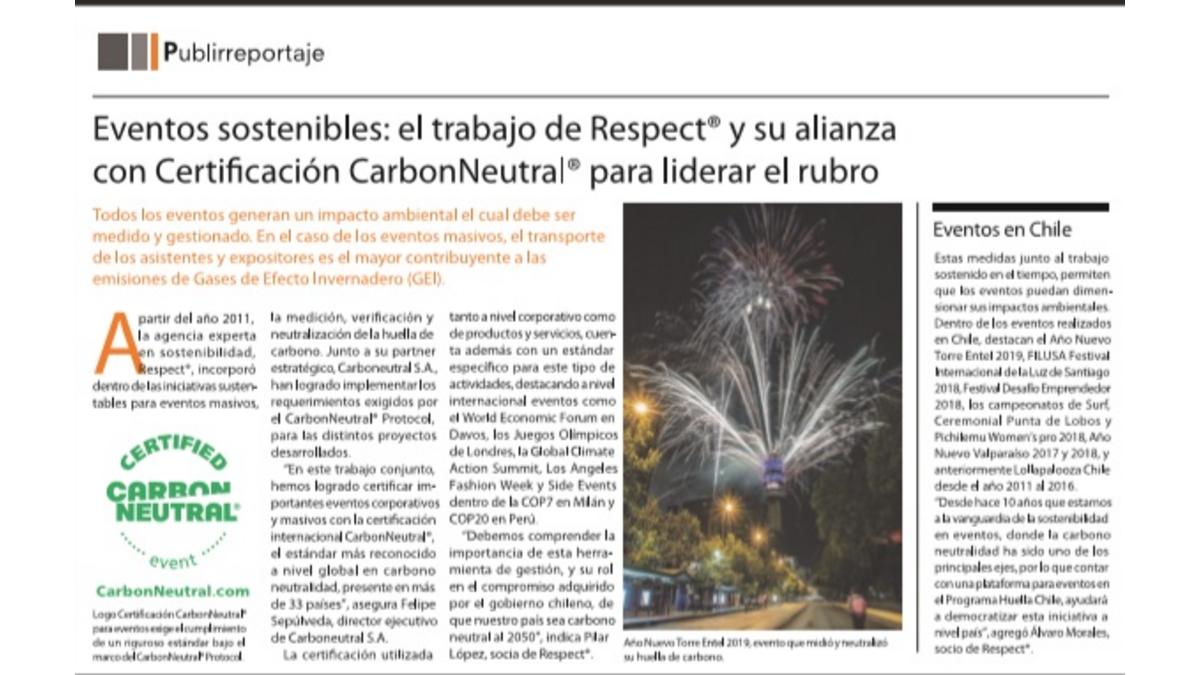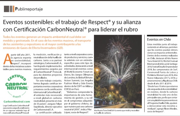 Nuestro socio Respect, empresa líder en asesorías de sustentabilidad en eventos masivos, apareció en Pulso (el suplemento de negocios del diario La Tercera) con un publirreportaje especial sobre el sello de reconocimiento a los eventos que cuantifiquen su huella de carbono y que neutralizan sus emisiones de GEI.