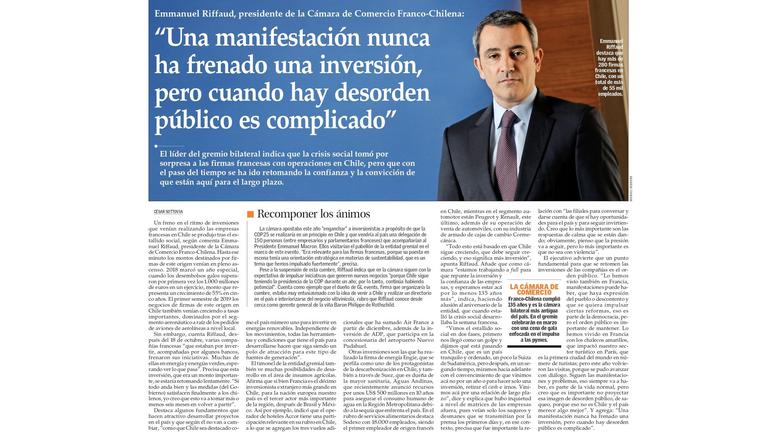 El líder del gremio bilateral, Emmanuel Riffaud, indica que la crisis social tomó por sorpresa a las firmas francesas con operaciones en Chile, pero…